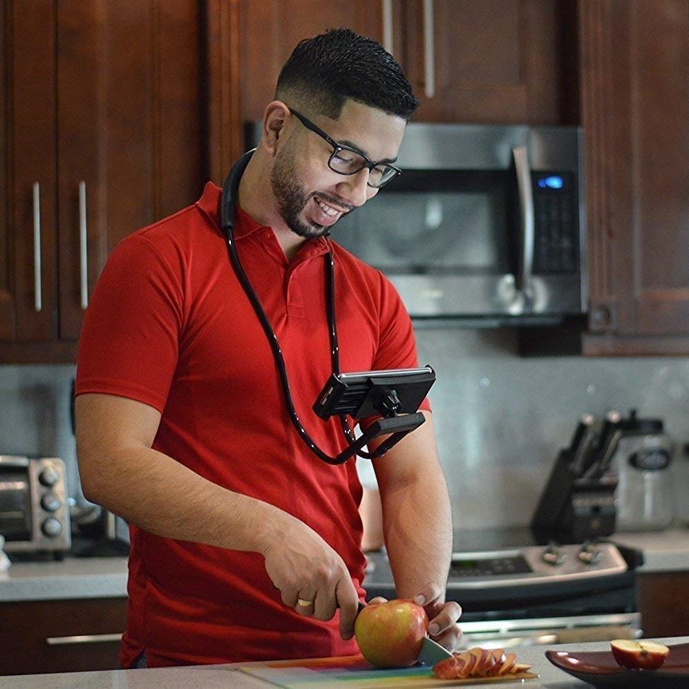 Flexily™, a neck phone holder for binge-watching, gaming, following recipes, and more without numbing your arms!! Flexily™ hangs comfortably around your neck, the flexible phone holder is provided with soft foam. Being adjustable, it is compatible with all smartphones, tablets, and iPads. Rotate it 360° in your desired direction.