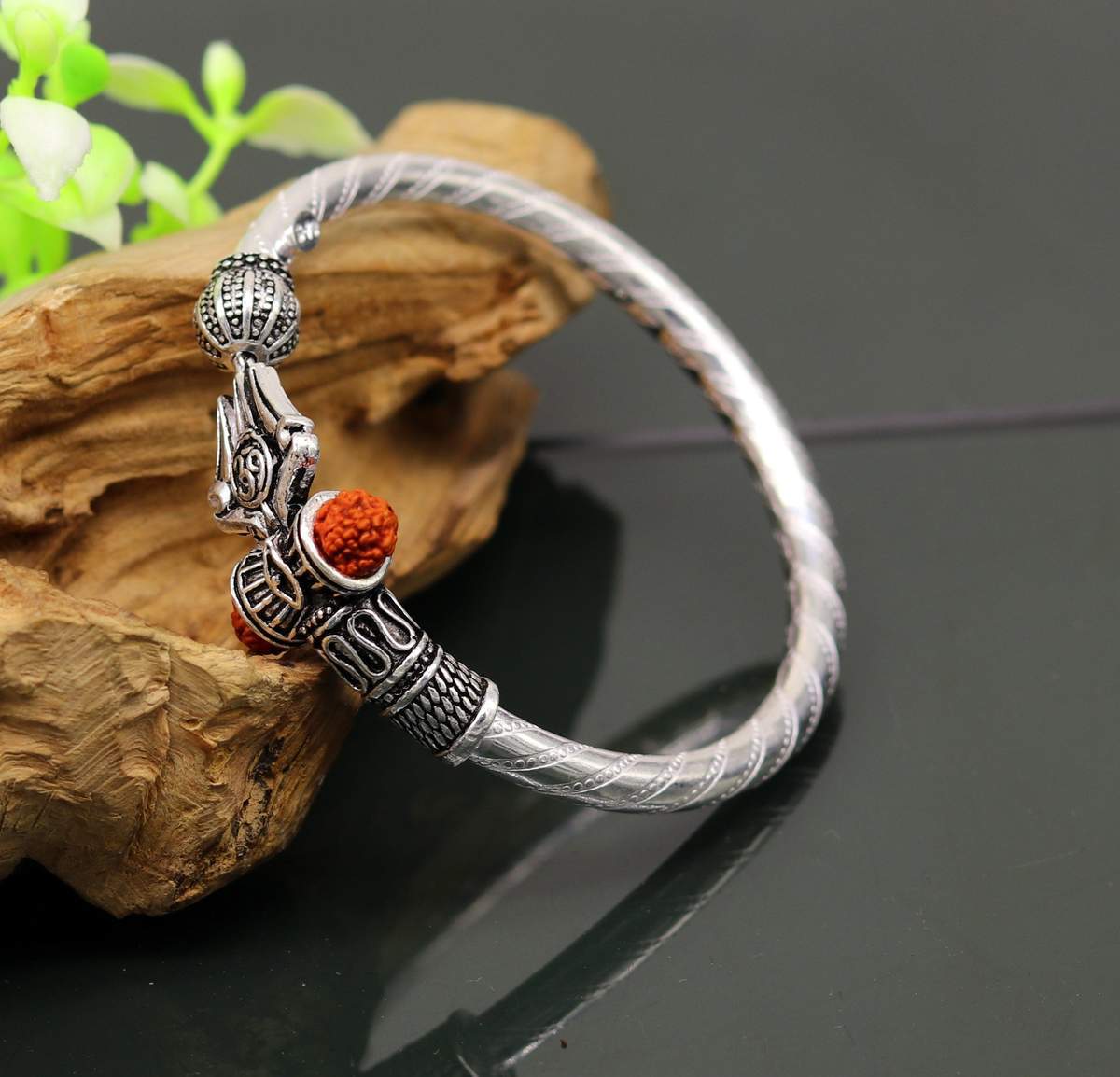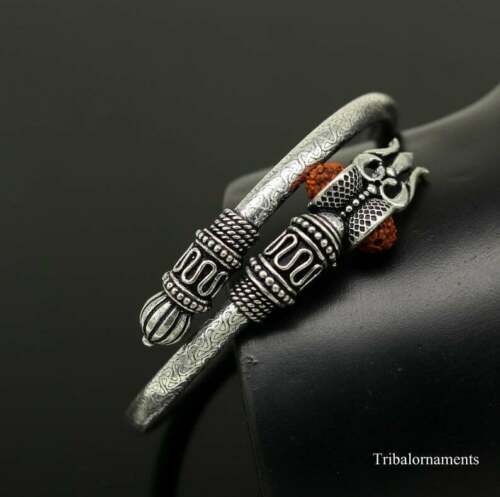 Plated with pure silver, this unisex bracelet is created with Rudraksha beads, Trishul and Damru that has AUM engraved on it.